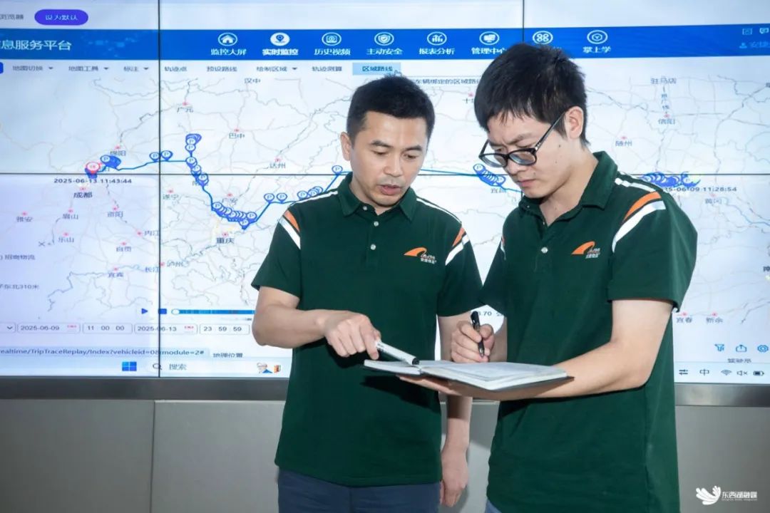 王其兵(左)查看线路运营情况。