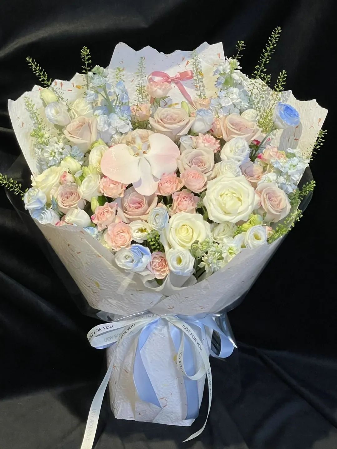 店里的花束款式都由她自己设计,一般花店很难复刻。“我用的花品类多,甚至会用10多种不同的花材融合搭配,用吸色、喷色等不同技法上色,店里包装纸和飘带也有几百种,韩素纸、欧雅纸、雪梨纸、提花网、蜂窝纸这些都有。”李潇边说边拉开旁边的抽屉,里面卷着各色飘带,银的闪着细钻,粉的印着小爱心。
