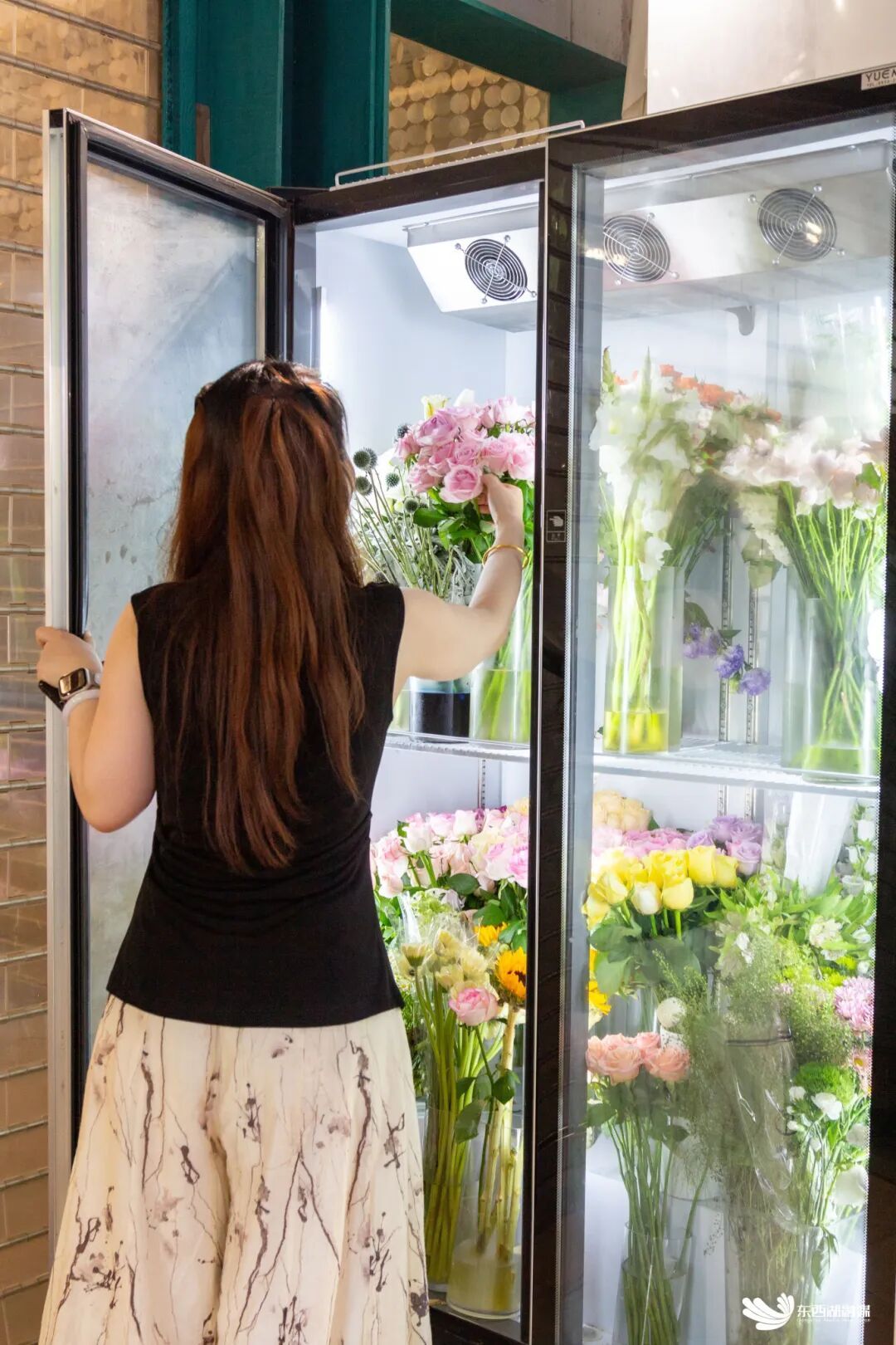 店主李潇将一束百合插入瓶中,小心地整理着花瓣。“这些花在我手上必须保持最好的状态,到客人那里再绽放得开一些,尽量让花保存时间更长!不能只是让顾客看几眼拍个照,就蔫了。”为了让花状态更好一些,她专门给鲜花准备了冰箱和空调房,并且坚持每一束花都在要交花之前现做。