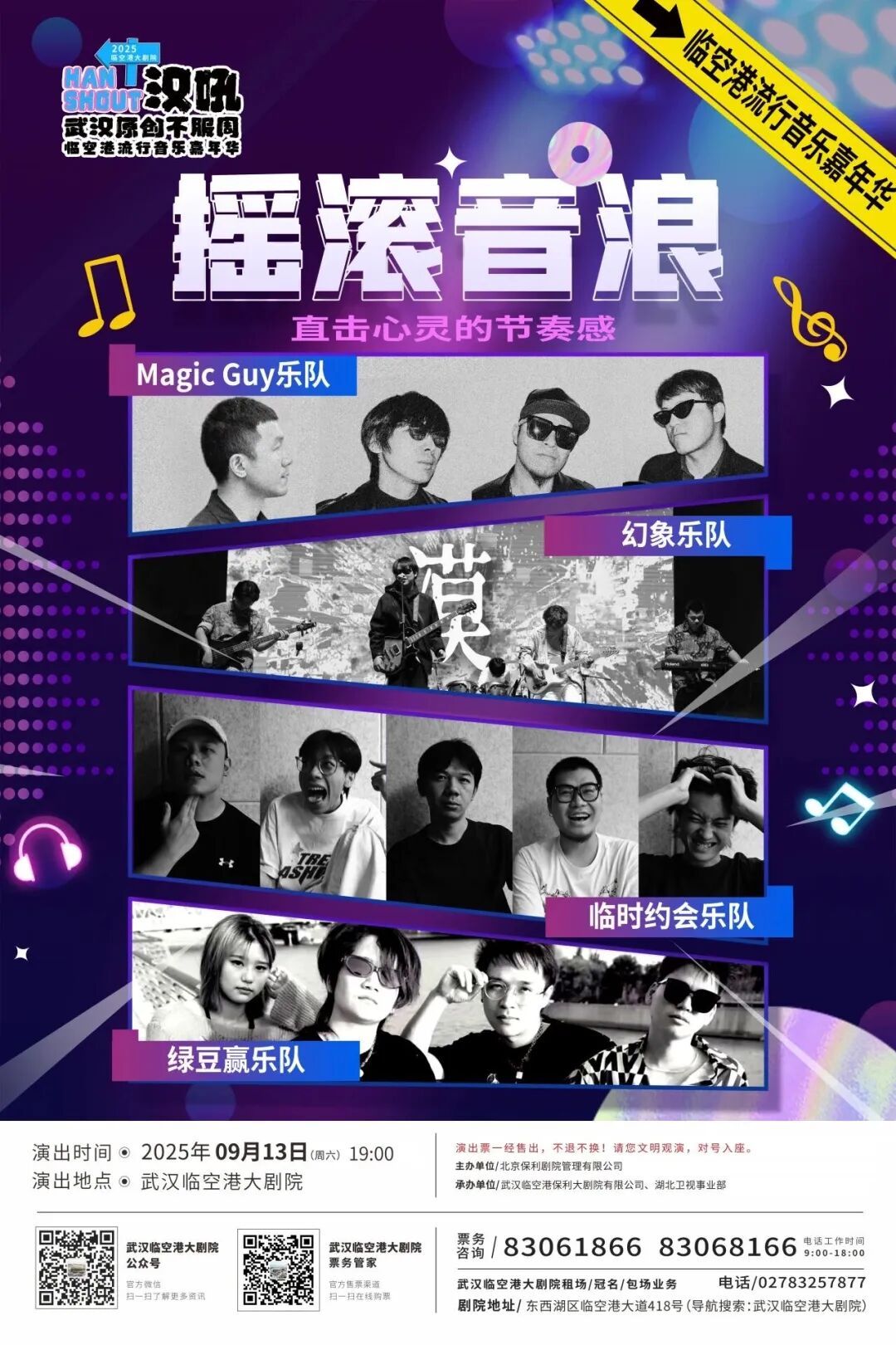绿豆赢、临时约会、幻象、Magic Guy——实力摇滚乐队同台飙技,用最躁动的现场点燃你的热血!全场大合唱、即兴solo battle、乐队PK环节——这不是演出,而是一场属于摇滚乐迷的狂欢派对!