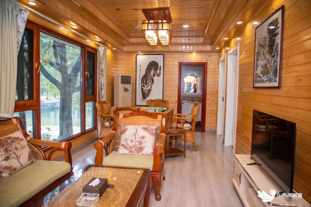 屋内的装饰更是独具匠心。天顶以古籍灯片装饰,浑朴古雅,典雅大气。当夜幕降临,灯光亮起,仿佛穿越回了古代的书香门第,让人感受到浓厚的书卷气息。窗外,湖光潋滟,清风细语,仿佛是大自然在耳边轻声诉说着故事。
