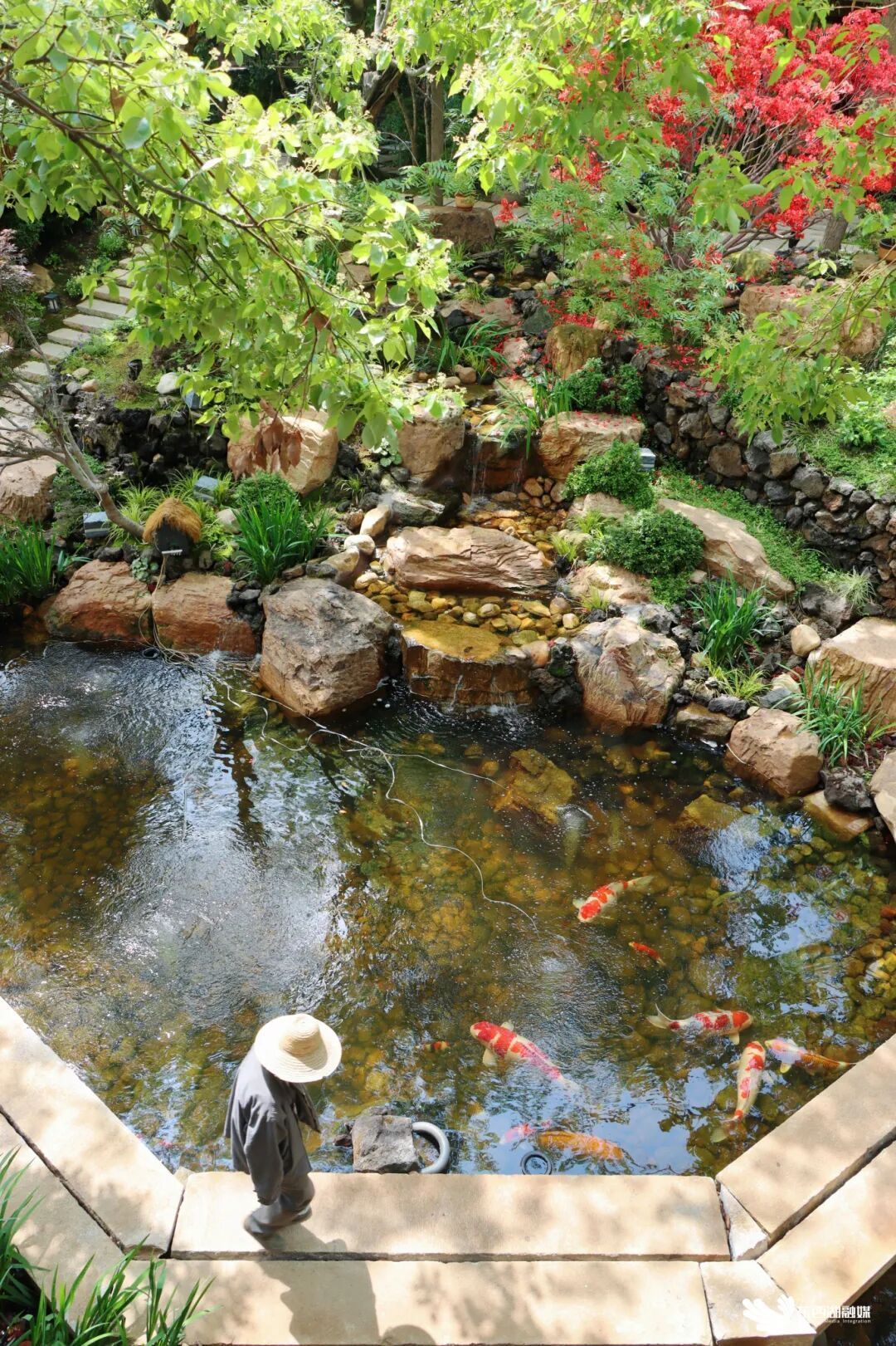 沿着石子小径深入,会发现一处精致的园林景观。两旁是葱郁的微型植物,尽头一棵200年树龄的红花杜鹃如火绽放。树下一潭碧水中,肥硕的锦鲤悠然游弋,丝毫不怕人。