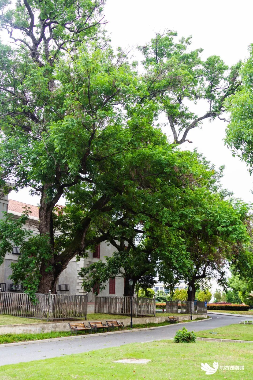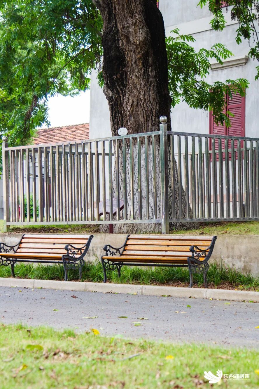 树荫下,几把棕色靠椅可供游客歇脚。一阵风来,枫杨树叶沙沙作响,教堂偶尔传来的钟声,让人不自觉放慢脚步。抬头看,枫杨树叶夹着果实簌簌而下,在风中飞舞盘旋,再落到地面,轻轻柔柔的,时光在这一刻都变得温柔而缓慢。