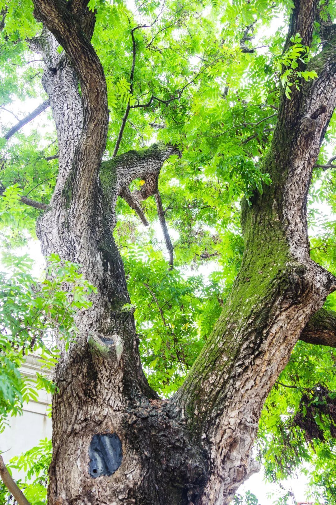从天主堂移步到景德寺,古寺禅意悠悠,门口的朴树是“镇寺之宝”,年龄已超120岁,却依旧新绿满枝,生命力顽强。灰褐色树皮粗糙,树枝向四周伸展,宛如为古寺的大门撑起了大伞。
