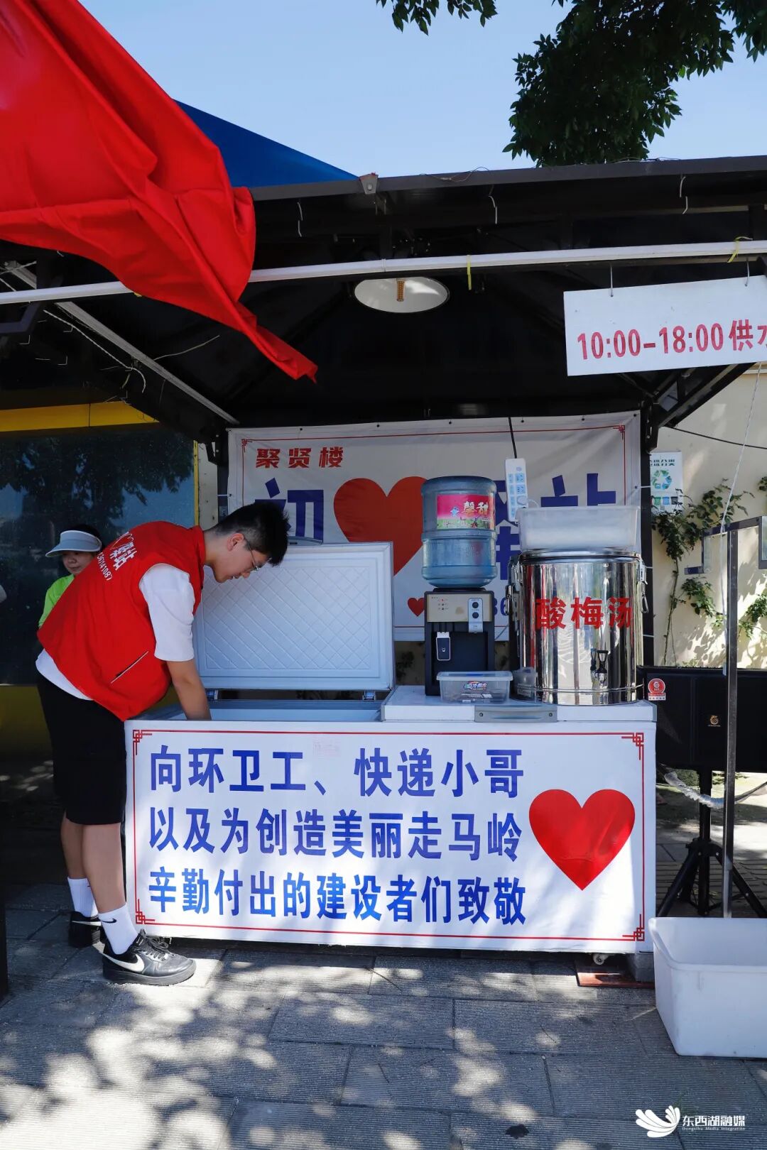 四年前,餐饮老板杨长安自掏腰包置柜,每年数万元支出换来了户外工作者的夏日清凉。如今接力棒交到杨智宇手中,这个年轻人每天早晚打理冰柜,让跨越代际的爱心持续传递。