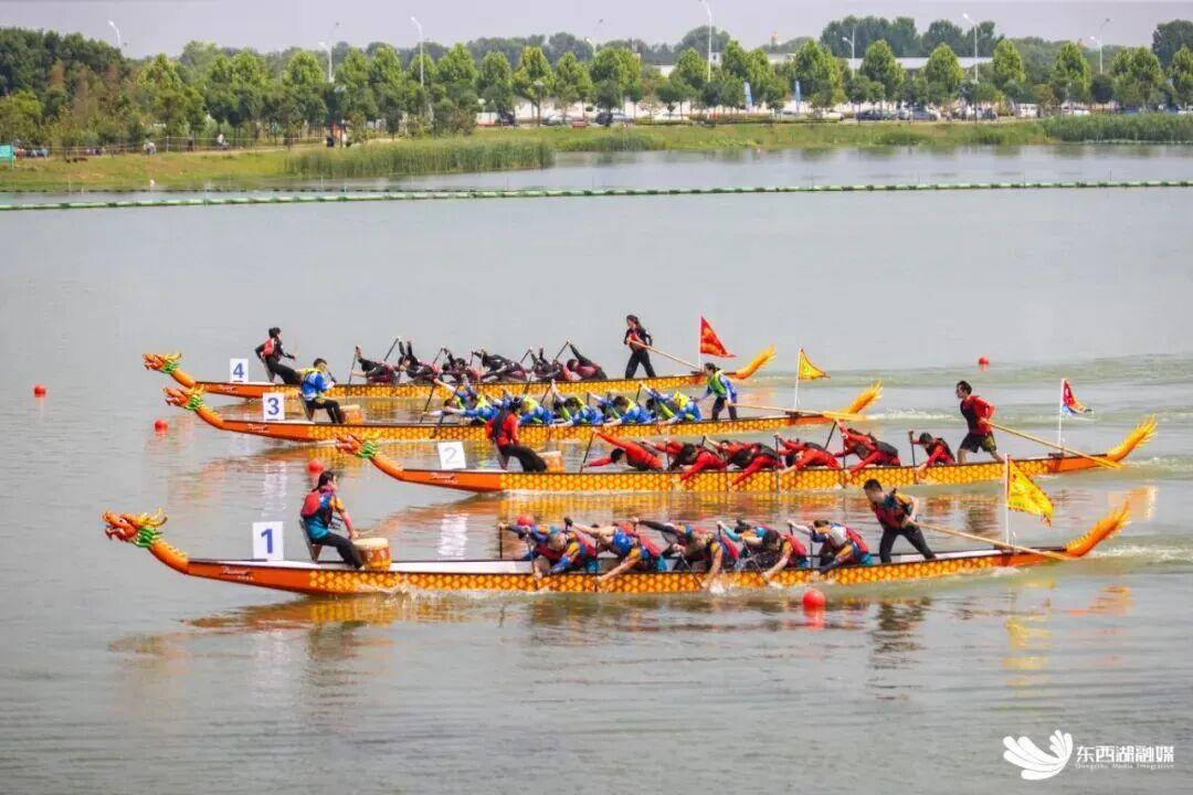 龙舟竞渡,队员们在杜公湖水面奋勇争先。