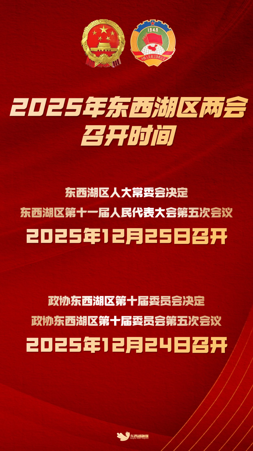 定了!东西湖两会即将召开 2025-12-22 18:10 东西湖融媒 0 奔赴2026 你最关注哪些问题? /// 就业、教育 医疗、居住、养老…… 两会期间 【 东西湖融媒】 将第一时间为您推送 两会动态 敬请关注