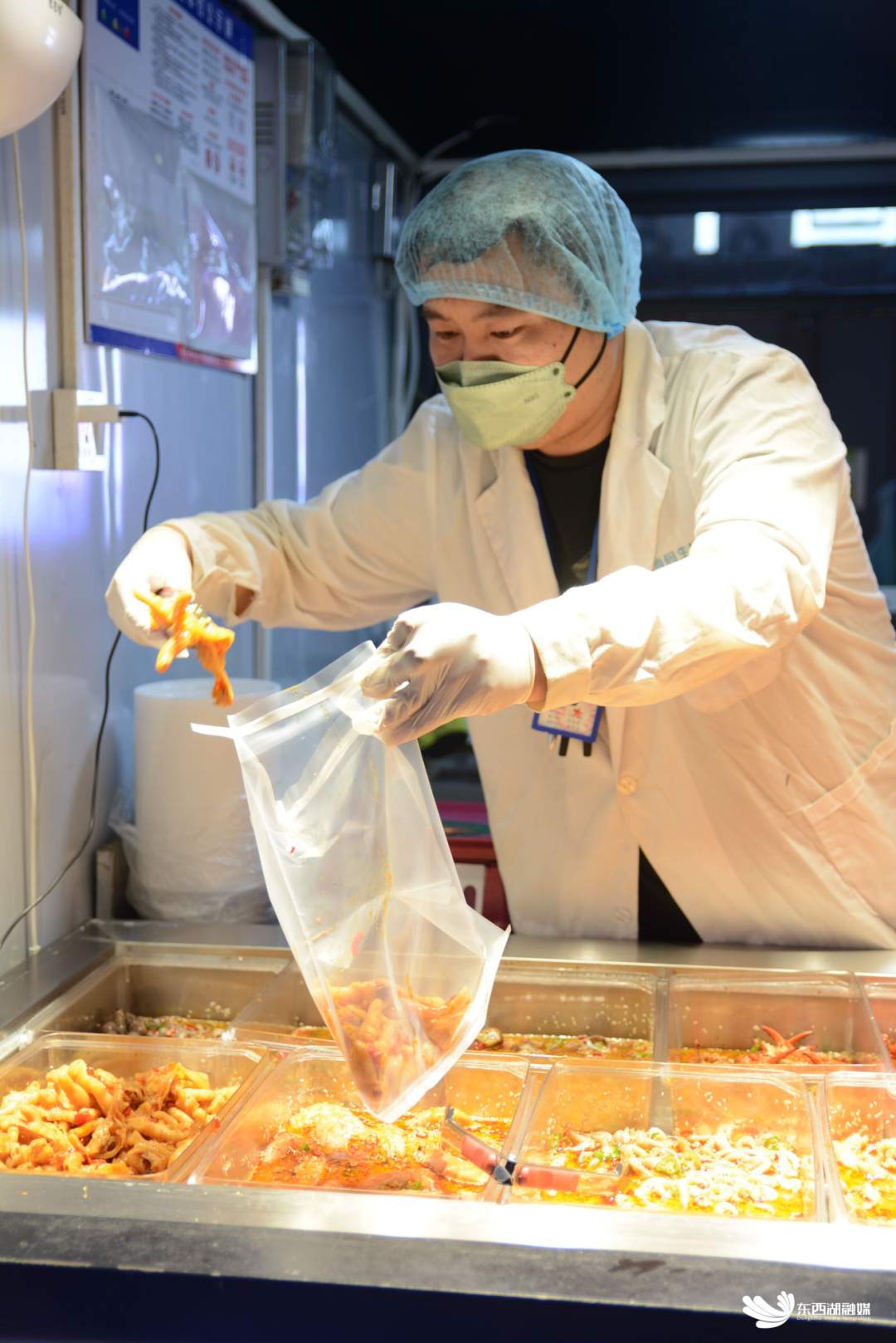在仟那广场夜市,“明厨亮灶”智慧监管模式推行,目前,夜市内31家餐饮单位的后厨已全部接入“鄂食安”平台及美团“明厨亮灶”板块。记者在现场看到,这些集装箱商亭里的上方梁柱上,都装有一个黑色的摄像头,摄像头下,工作人员规范佩戴着口罩,熟练地处理着食材。