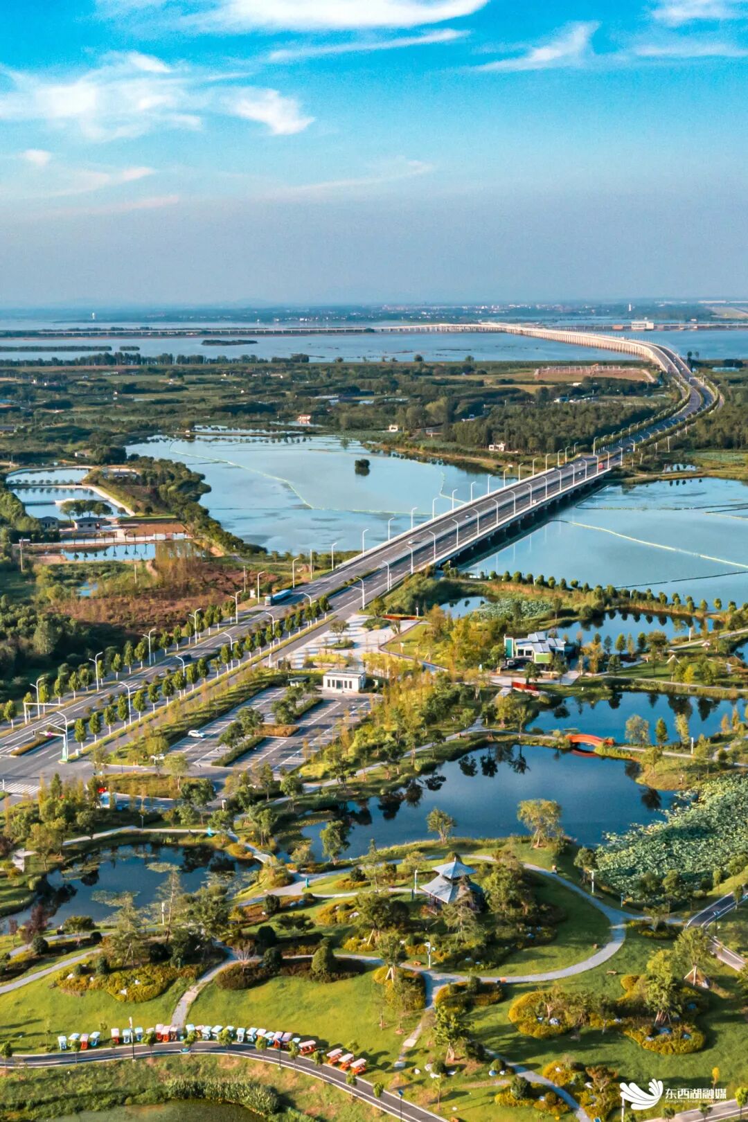 东西湖,史属古云梦泽东隅,五千年前便有先民踏水聚居、渔猎耕耘,柏泉茅庙集印刻着千年市集的繁华喧嚣,新沟古镇述说着汉水码头的光阴故事。东西湖因湖得名,缘水而兴,一条由南至北的垄岗地带分隔开东、西两大泛水湖群,“东西湖”之名由此而来。