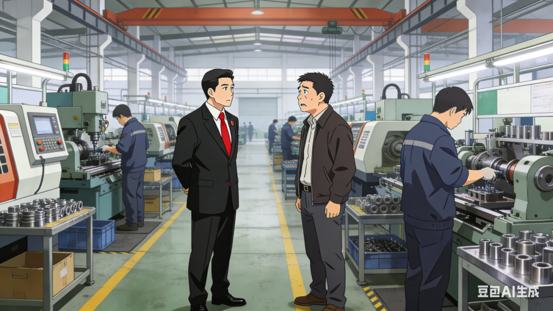 执行法官在企业生产车间了解生产销售情况。(AI生成)