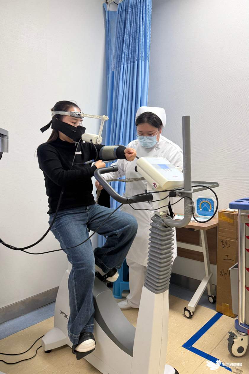 在医护人员指导下,开展“体外反搏”(左)和心肺运动试验(右)。