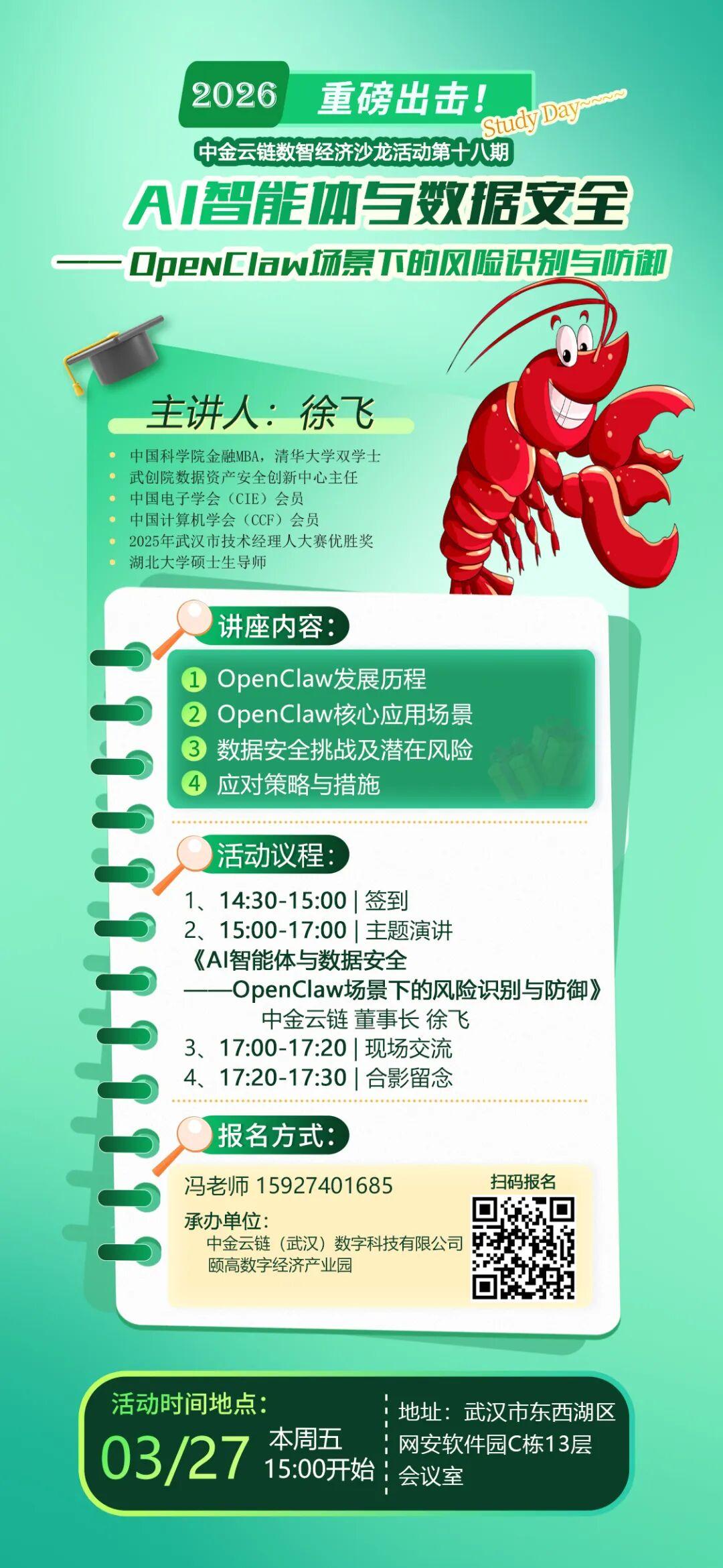 3月27日,中金云链数智经济沙龙第十八期将在东西湖区网安软件园开讲,聚焦《AI智能体与数据安全——OpenClaw场景下的风险识别与防御》,为从业者和市民拆解AI时代的安全密码。