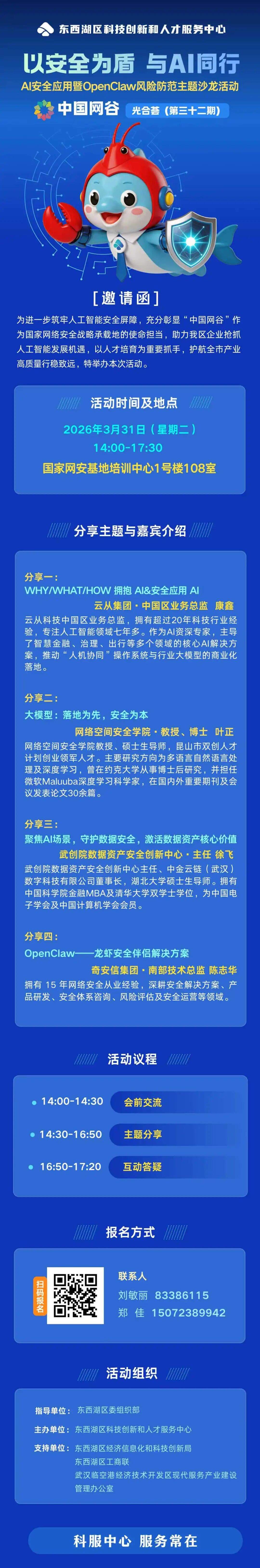 3月31日下午,由东西湖区委组织部指导,东西湖区科技创新和人才服务中心主办的“中国网谷·光合荟(第三十二期)”——“AI安全应用暨OpenClaw风险防范主题沙龙”,将在国家网络安全人才与创新基地重磅开启。