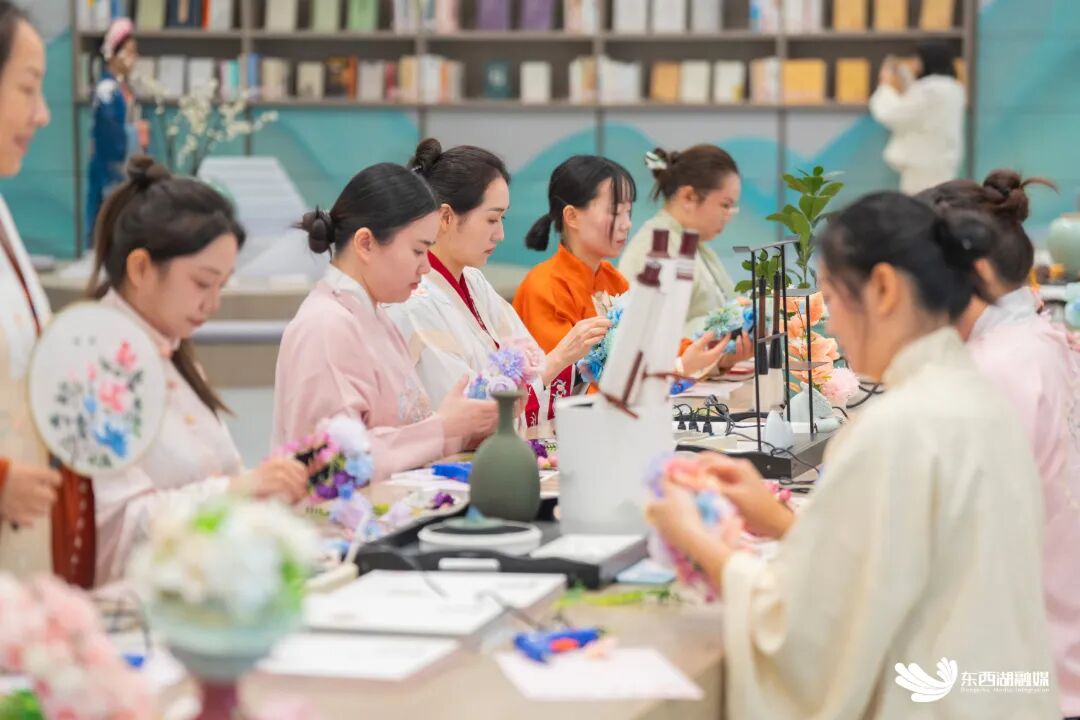 文创市集汇聚“武汉礼物”“玩转东西湖”“大地宝藏”等近40家知名图书与文创品牌,特色产品琳琅满目、独具匠心。在区图书馆“风雅颂·国风馆”内,非遗传承人现场展示缠花的传统技艺,市民踊跃参与体验,阅读与非遗传承深度融合,在动手实践中感受传统文化的独特魅力。