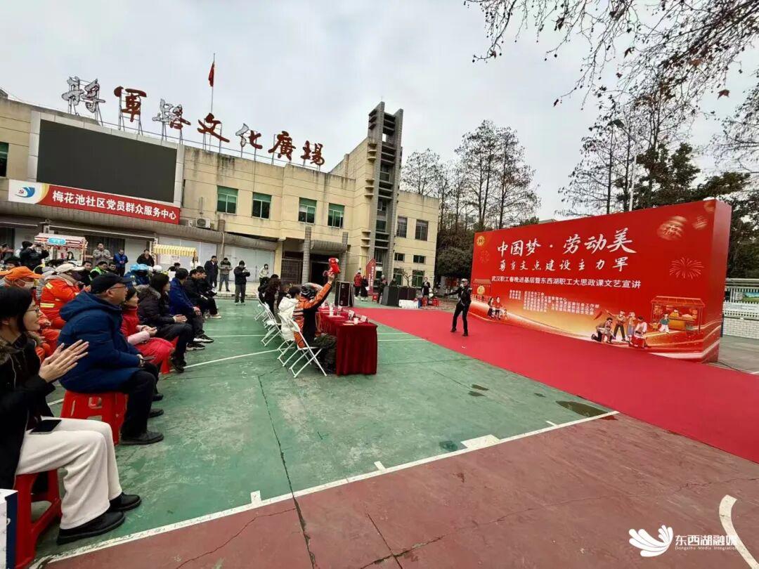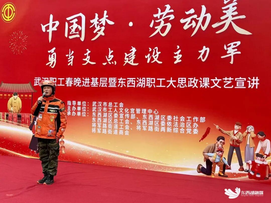 1月27日下午,东西湖区将军路文化广场上人头攒动,由武汉市总工会指导,东西湖区委宣传部、区委社会工作部、区总工会、将军路街工会等单位联合承办的“中国梦·劳动美——勇当支点建设主力军”武汉职工春晚进基层暨东西湖职工大思政课文艺宣讲活动正如火如荼举行。